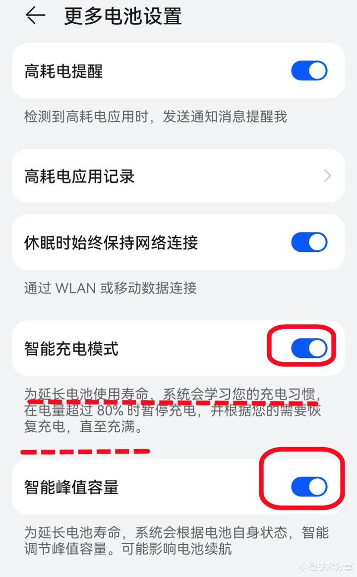 我们把它点进去,点进去把【智能充电方式】和【智能峰值容量】开关翻开。