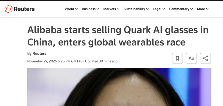 【环球网科技详尽报谈】11月27日,路透社报谈,阿里巴巴发布了旗下首款AI眼镜——夸克AI眼镜,这标记着阿里巴巴崇拜投入由Meta主导的AI可衣着竖立市集。