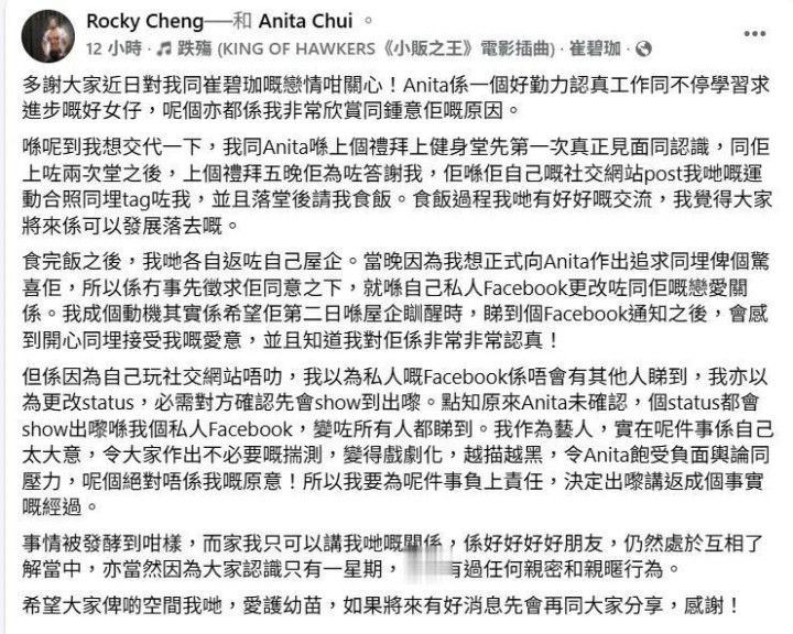 郑健乐前日(12月17日)在叮嘱平台发文,贯通与女方的相干。他指两东说念主是上周健身课初度重大,课后共进晚餐且换取欢乐。他坦言因但愿追求对方,在未获欢跃的情况下于私东说念主脸书转换了恋爱情景,导致外界曲解,使女方承受压力。